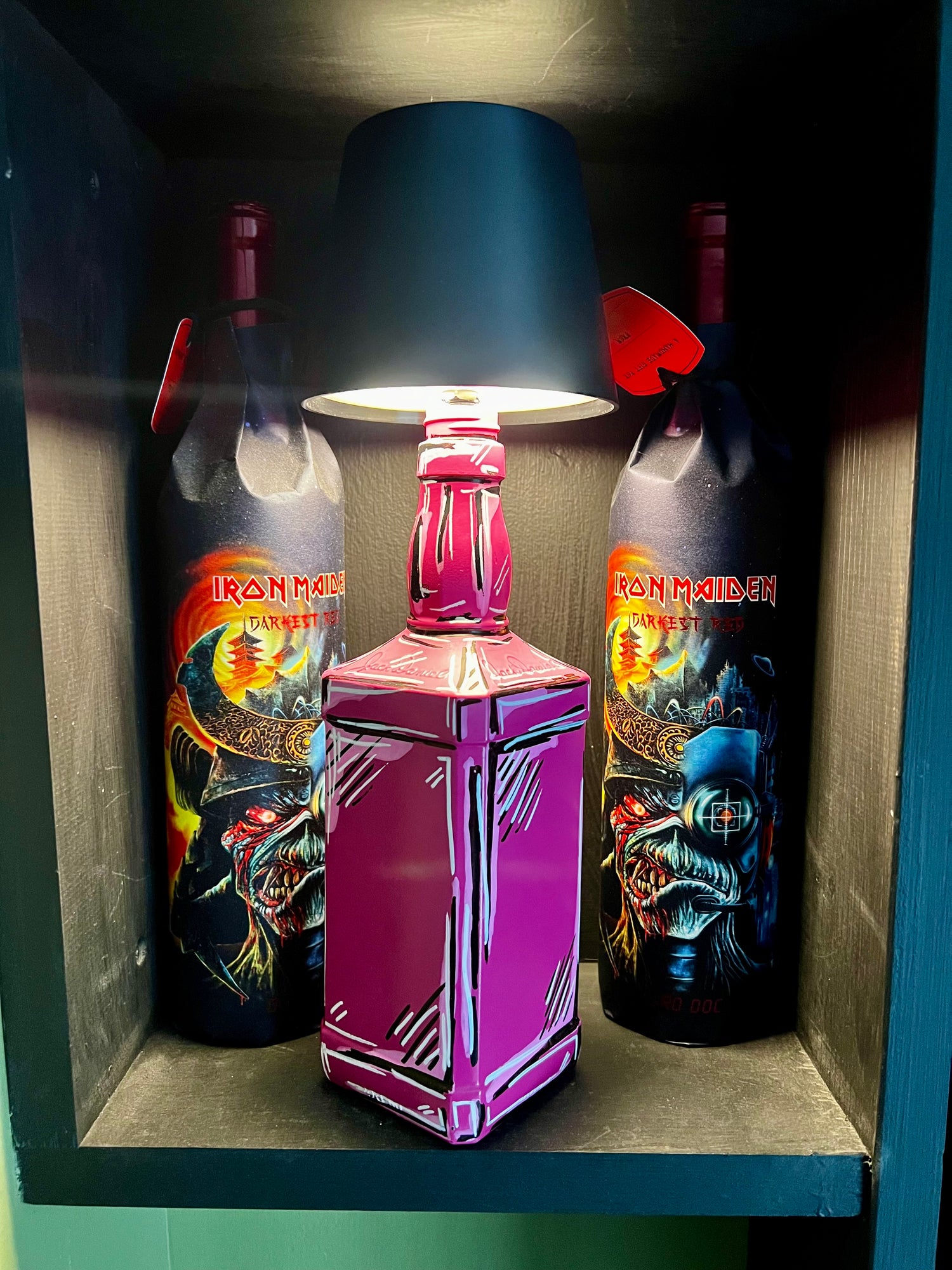 Each bottle lamp is individually created using rescued bottles, featuring custom graphics and hand-finished details. No two are the same, and each piece is made to be both functional and decorative. I hold stock and can offer custom, commissioned pieces.